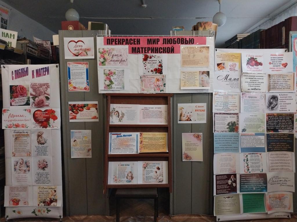 В Синелипяговском библиотечном филиале №17 к этому дню подготовили выставку-признание «Прекрасен мир любовью материнской». На ней представлены цитаты и стихи, посвящённые маме – самому дорогому человеку.