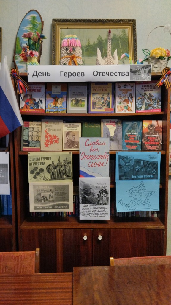 В библиотеке, в дополнении к мероприятию, была организована книжная выставка «День Героев Отечества», где представлены разножанровые произведения для читателей. Здесь посетители смогли найти для себя произведения о героях прошлых лет и настоящего времени. Мероприятие пришлось по душе как юным читателям, так и взрослому населению.