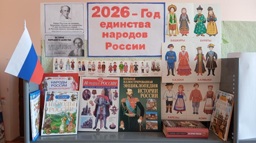 В рамках подготовки к этому знаменательному событию в Курбатовском библиотечном филиале открылась тематическая выставка «2026 – Год единства народов России». На выставке были представлены книги из фонда библиотеки по следующим тематическим рубрикам: история объединения Российского государства; этнографический обзор народностей, проживающих на территории России, с анализом их традиций и культурного наследия; биографии выдающихся личностей, способствовавших объединению российского государства; а также художественная литература, отражающая культурное многообразие народов России.