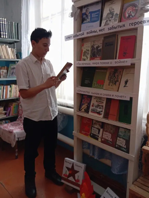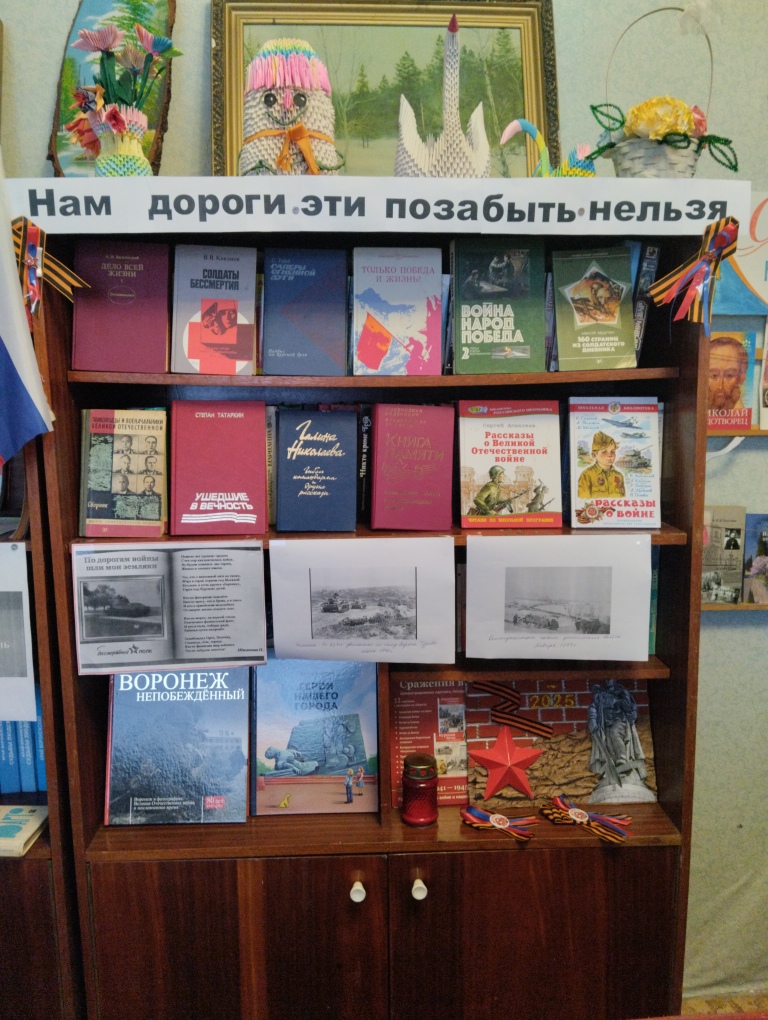 Также в библиотеке была оформлена книжная выставка «Нам дороги эти позабыть нельзя», где читатели познакомились с произведениями писателей и поэтов, рассказывающих о суровых днях войны. Военные страницы книг напомнили присутствующим о стойкости, мужестве и верности русского народа.