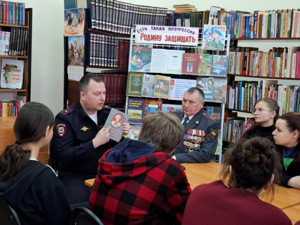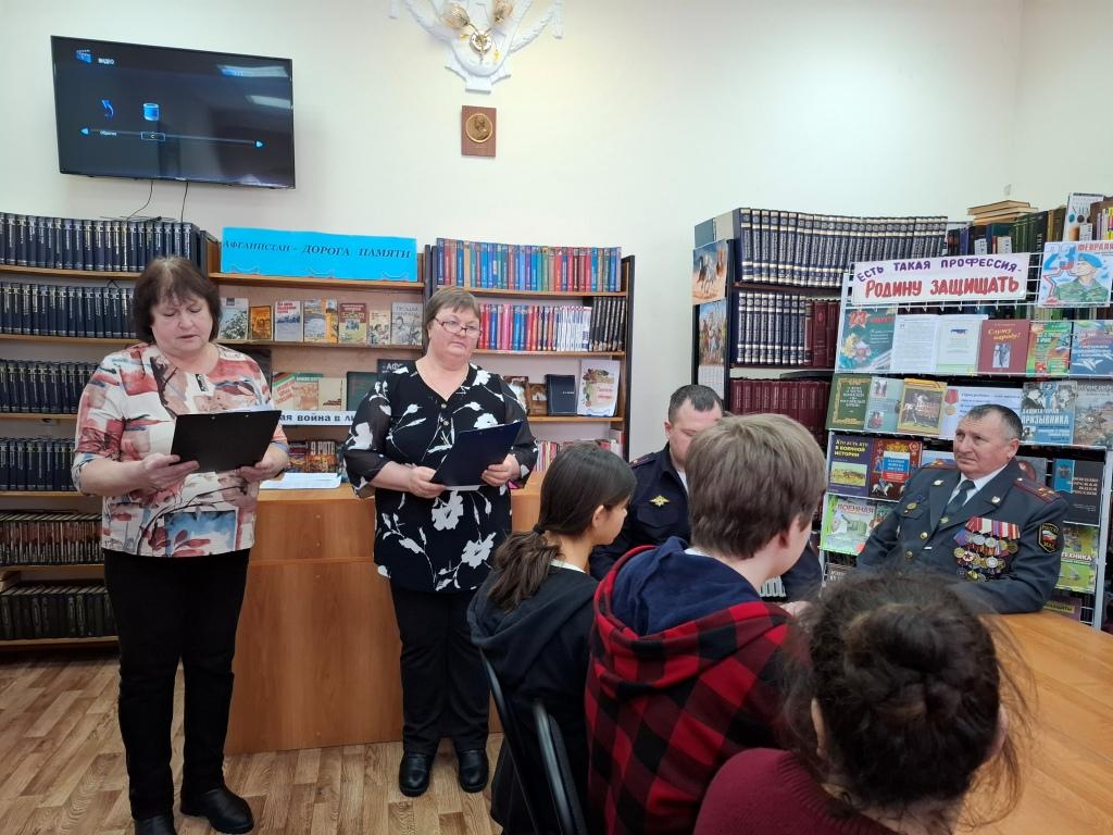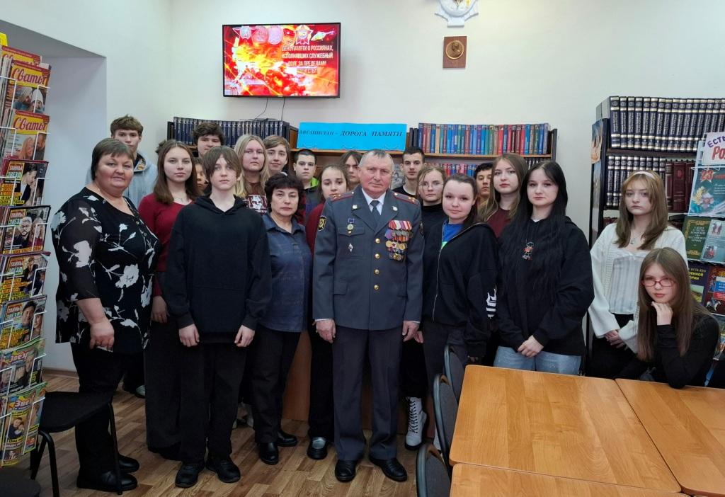12 февраля в районной библиотеке прошёл вечер – встреча с участниками военной операции Чеченской Народной Республики. На него были приглашены : полковник милиции в отставке Просветов Сергей Павлович и его сын заместитель начальника отделения МВД России по Нижнедевицкому району Просветов Максим Сергеевич. Встреча проходила с учащимися 9а класса Нижнедевицкой гимназии. Ведущие мероприятия Татьяна Плохих и Ключникова Татьяна познакомили ребят с историческими событиями войны в Афганистане и Чечне. Присутствующие узнали о событиях, предшествовавших введению советских войск в Афганистан, о причинах начала необъявленной войны и её продолжительности, о невосполнимых потерях советских войск. Ведущие рассказали о том, почему так важно помнить о подвигах воинов – интернационалистов, о трудностях солдатской доли, героизме и стойкости советских воинов, об их самопожертвовании во имя Родины. Ребята узнали о таких понятиях как «выполнение интернационального долга», «локальные войны», «горячие точки». Рассказ библиотекарей сопровождался видеороликами «Пришёл приказ», «Боевым награждается орденом». Всех погибших почтили минутой молчания.