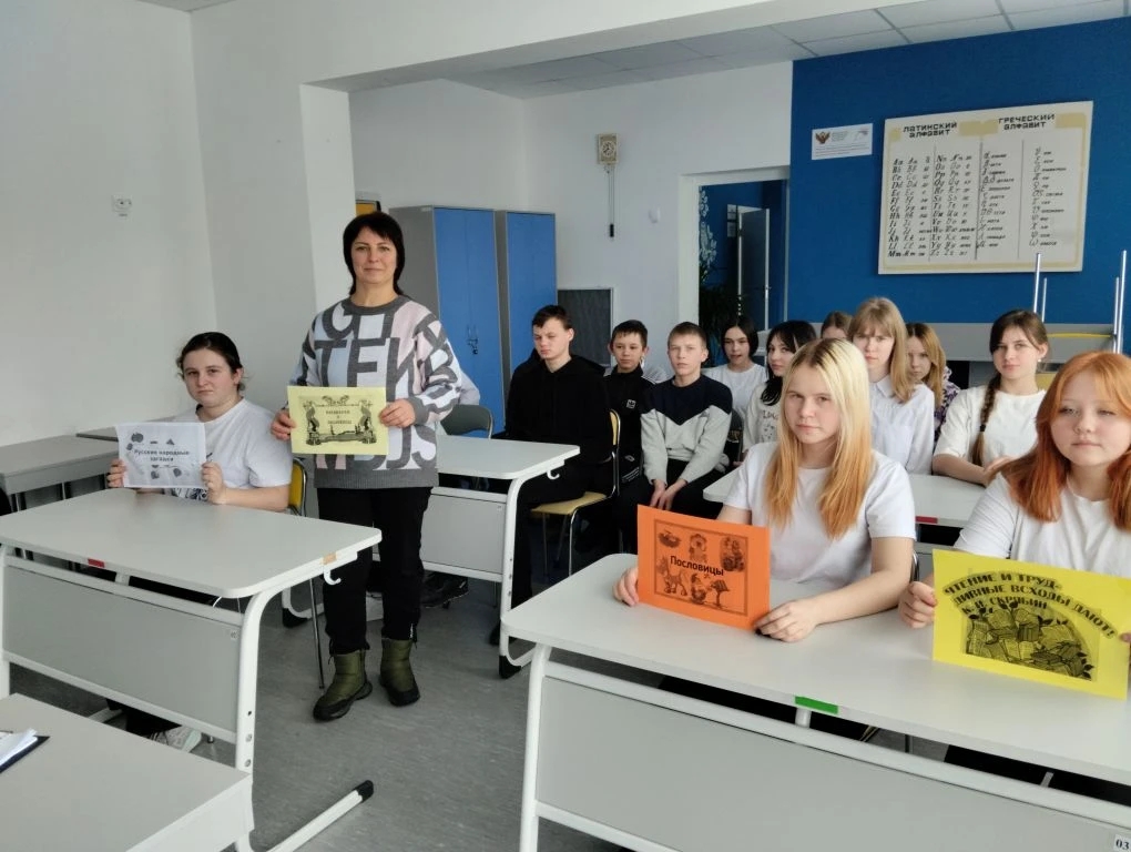 Алла Викторовна подробно рассказала ребятам о сути фольклора, его значении для народа и разнообразии жанров: песнях, играх, загадках, пословицах, сказках и былинах. Особый интерес у участников вызвала интерактивная часть встречи — школьники с удовольствием участвовали в играх, составляли пословицы, разгадывали ребусы и загадки, а также соревновались в скороговорках. Такой формат позволил не только закрепить полученные знания, но и сделать процесс обучения живым и запоминающимся.