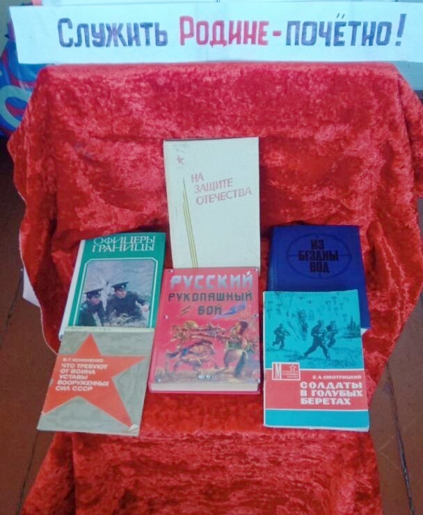 В Лесополянской библиотеке организована книжная выставка для молодёжи, посвящённой Дню защитников Отечества. На ней представлены книги для будущих воинов, рассказывающие о сложной и ответственной службе на границе, героической службе на подводной лодке, а также о требованиях, предъявляемых к защитникам Отечества. Особое внимание привлекает книга по русскому рукопашному бою, которая будет полезна каждому молодому человеку, особенно тем, кто готовится к службе в армии.
